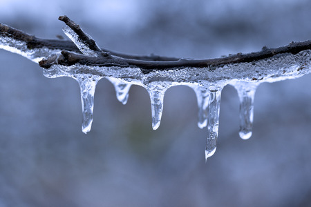 Ice icicles on a branch of a blue Christmas tree, close-up. The concept from now on, change of weather, rain and frost.