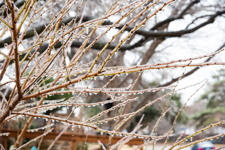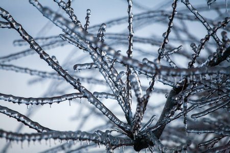 Lookup view of fruit tree branches in the ice at front yard garden near Dallas, Texas, America. Frosted icicle on dormant tree after ice storm severe weather damages during the cold months.