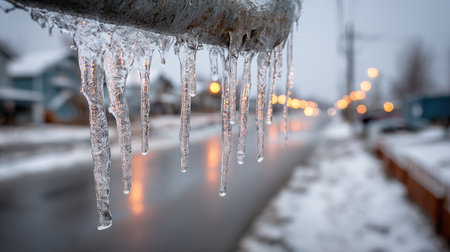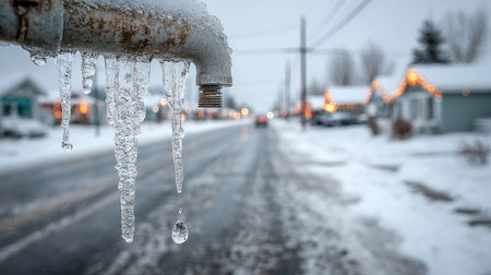 A serene urban winter scene featuring icicles hanging from a pipe, a snowy street lined with homes adorned with festive lights, capturing the beauty of the season.