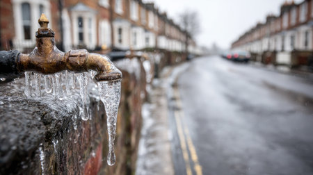 A winter scene featuring a frozen water tap dripping icicles alongside a quiet urban street. The image captures the contrast between cold elements and residential architecture, evoking a serene yet chilly atmosphere.