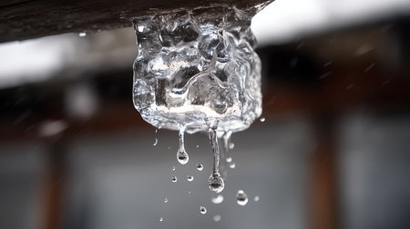 Water droplets fall from melting icicles, creating a peaceful scene against a blurred blue backdrop. This moment captures the transition from winter to spring in nature.