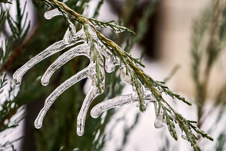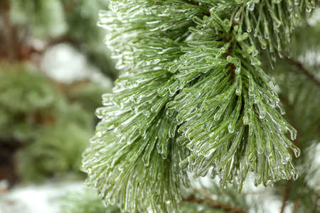 Icing in the world of branch with long green needles covered with a thin layer of ice on a winter day.