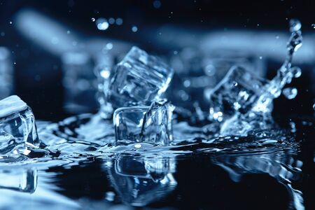 Water splashing and ice cube. Ice splashing into a glass of water. Underwater pouring ice cubes falling into clear watering background. Refreshing chill drinking. Ices in a glass with blue background