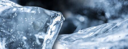 Ice cubes are scattered with water drops scattered on a blue background. close up. Refreshing ice.