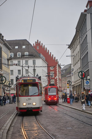 Freiburg, Germany - December 22, 2025:The famous city during the Christmas season. Festive atmosphere with historic architecture and everyday city life visible. Historic trams at the famous old town.