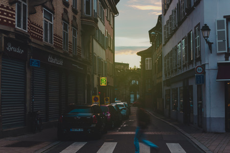 STRASBOURG, FRANCE - MAY 29, 2017: French architecure and cars driving on the tiny cozy street at dusk with beautiful sunset above