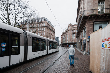 Strasbourg, France - Nov 3, 2020: Rear view of one single man on the almost empty street with one tramway public transportation during second wave of lockdown in France