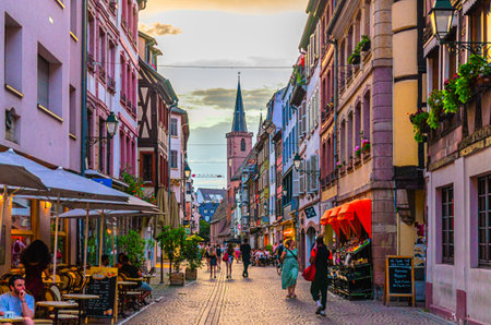 Strasbourg, France, July 11, 2024: people tourists walking pedestrian street Grand Rue with restaurants and cafes, medieval houses old buildings in old town Strasbourg city Centre, Alsace region