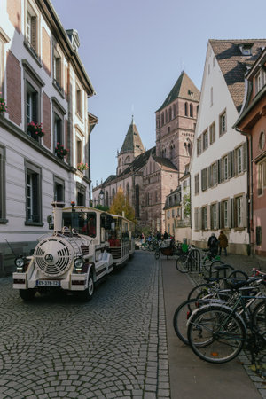 Strasbourg, France - October 25, 2021: Monnaie street with church St. Thomas in the old town La Petite France