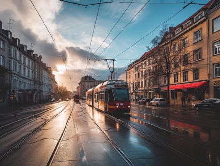 Sunset light casts a warm glow on a city tram street.