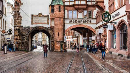 Freiburg im Breisgau, Germany - December 28, 2023: Medieval City Gate with in Freiburg im Breisgau - urban life.