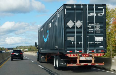Blue Bell, Pennsylvania, U.S.A - October 15, 2023 - A large Amazon truck moving on the highway during the day