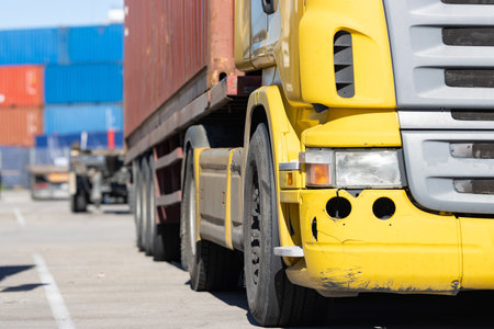 Yellow Container Truck Cargo Freight extreme closeup. Generative AI