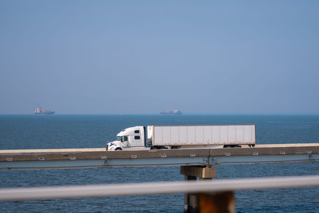 Truck driving across the bridge near sea or ocean. Lorry transporting. Cargo trailer. Logistics truck, international shipment. Heavy-duty truck transport. Semi truck containers, logistics industry.