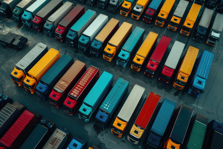 Truck transport fleet parked at delivery company yard for efficient logistics operations