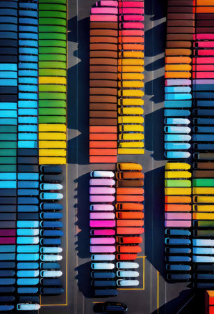 Aerial shot featuring a diverse array of shipping containers in vibrant colors, showcasing the dynamics of urban logistics and contemporary industrial design in a striking visual pattern.