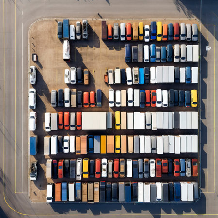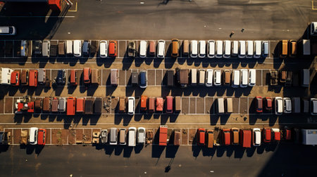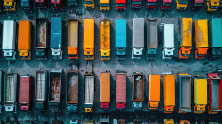 commercial fleet-semi trucks and delivery vans neatly parked in rows, illustrating the efficiency of a well-managed supply chain
