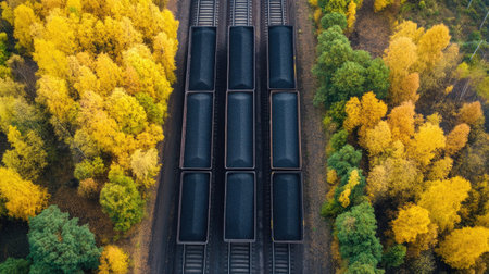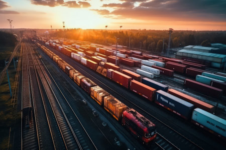 Aerial drone view of a freight train at a railway station, showcasing industrial transport infrastructure with steel tracks and cargo carriages. Ideal for logistics themes.