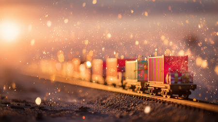 A colorful train carries holiday gift boxes as the sun rises filling the scene with warm light and a sense of joy for the New Year.
