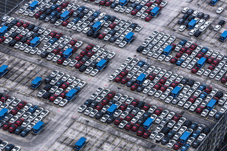 Aerial shot of parked cars in a structured row parking lease cars new production industry