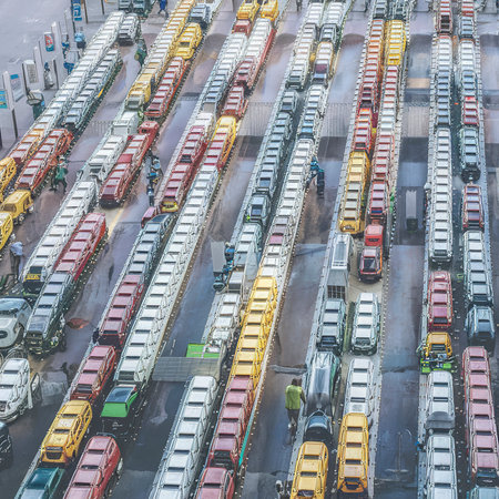 Many trucks in the parking lot, a queue of trucks for unloading. Top view. Concept of transportation and logistics