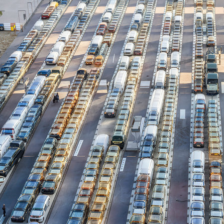 A large number of trucks near the port terminal. traffic jam on the road. The concept of transporting a large number of goods by road.