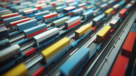 Wide-angle view of a busy highway with multiple freight trucks and cargo vehicles driving, showcasing the busy nature of freight transport with copy space.