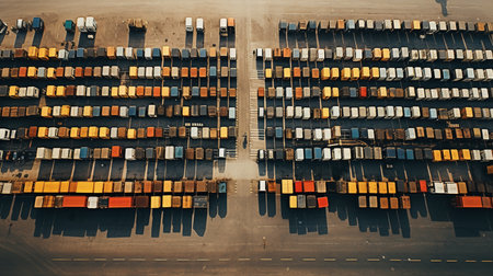 Aerial view new car lined up in the port for import and export business logistic to dealership for sale, Automobile and automotive car parking lot for commercial business industry. Created with Generative AI technology