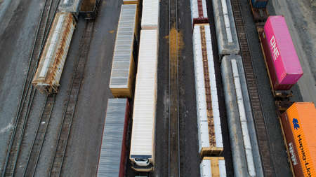 Large variety of cargo trains. Aerial view. Global business of Container Cargo freight train. Rail transportation and maritime shipping