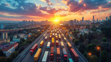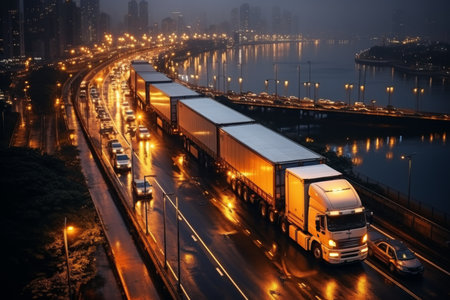 drone shot of cargo trucks on highway in a row, created with generative ai