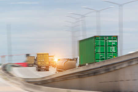 Green and green container truck on highway ,transportation concept.,import,export logistic industrial Transporting Land transport on the asphalt expressway