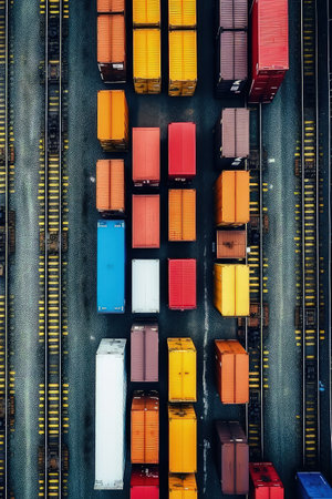 Large variety of cargo trains. Aerial view. Global business of Container Cargo freight train. Rail transportation and maritime shipping.