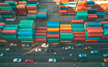 An aerial perspective of a busy shipping dock featuring colorful containers and various vehicles, showcasing the logistics and transportation industry.