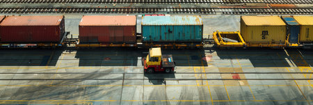 Containers are being transferred from a truck to a train at a transport terminal, illustrating seamless logistics integration.