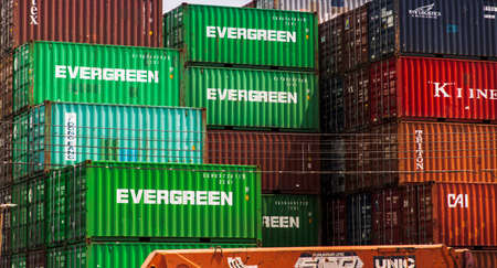 Bangkok,Thailand - May 20, 2021 : Industrial containers box for Logistic import export business concept. Stacked cargo containers in storage area. No focus, specifically.