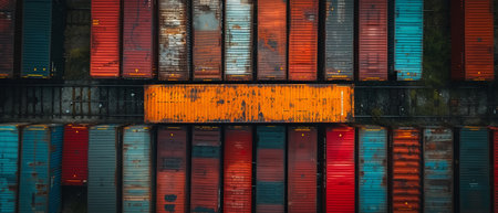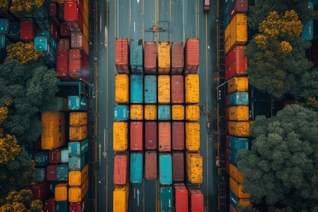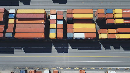 An aerial view showcasing organized rows of vibrant, multi-colored shipping containers in an industrial container terminal. This image highlights global trade infrastructure and logistical precision, capturing an abstract yet structured aesthetic.