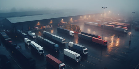 commercial fleet-semi trucks and delivery vans neatly parked in rows, illustrating the efficiency of a well-managed supply chain