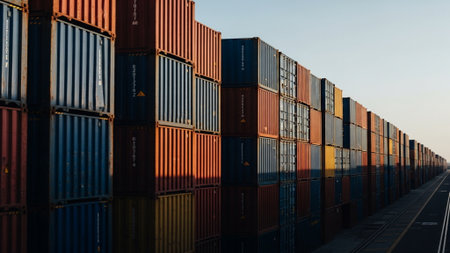 Rain-soaked cargo containers in vibrant colors stacked high, reflecting the bustling activity of global trade.