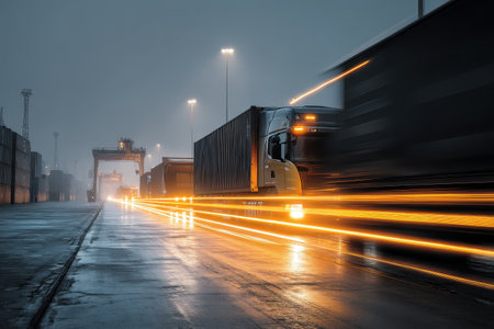 A busy shipping port scene captures trucks maneuvering through rain on a wet road, surrounded by towering cranes and colorful containers.