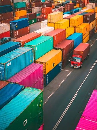 Stunning aerial view of vibrant shipping containers stacked at a busy port, with cranes actively working, symbolizing global trade, logistics, and maritime transportation efficiency.