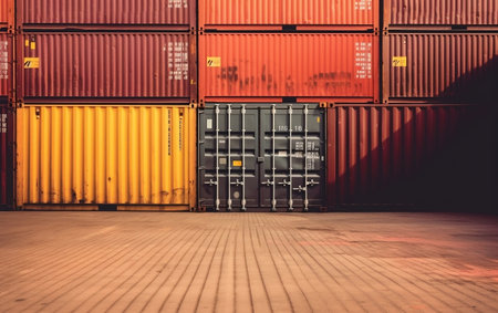 Container Cargo Port Ship Yard Storage Handling of Logistic Transportation Industry. Row of Stacking Containers of Freight Import/Export Distribution Warehouse. Shipping Logistics Transport Industrial
