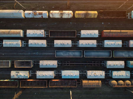 Aerial top view Passenger and freight trains on the railway station for transportation background. wagons with goods on railroad.