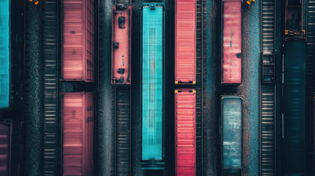 This aerial photograph captures a colorful arrangement of cargo containers stacked on train tracks, showcasing vibrant colors and intricate patterns in an industrial setting.