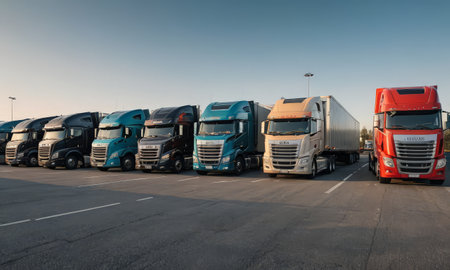 Line of Semi Trucks Parked in a Row at a Transportation Hub, Logistics and Supply Chain Management