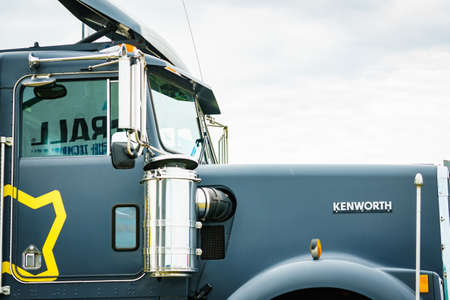 Bednary near Poznan, Poland - September 20, 2019: Logo of brand Kenworth on truck machine. Kenworth is an American manufacturer of medium and heavy-duty trucks. Agroshow in Poland.