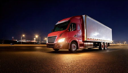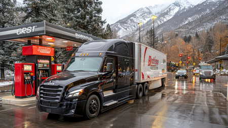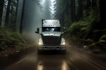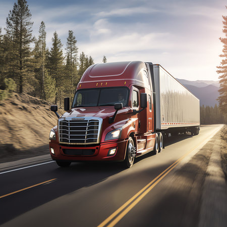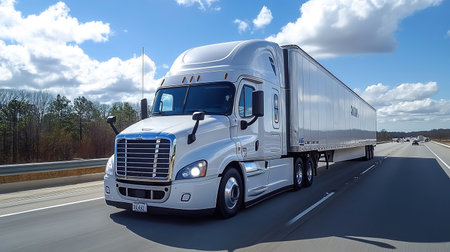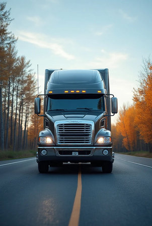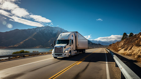 A powerful commercial truck dominates the highway symbolizing enduring transportation. Concept Transportation, Commercial Truck, Highway, Endurance, Power