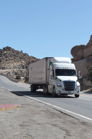 Tecate, Baja California, Mexico - Mar 18, 2025: Trailers travel along the dangerous and noisy highway from Tecate to Mexicali, Baja California, Mexico