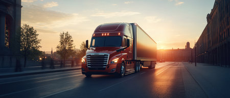 A vibrant red freight truck is making its way along a serene city street bathed in the warm glow of the golden hour. The urban landscape features well designed architecture on either side reflecting the last rays of sunlight. The truck loaded and illuminated embodies the hustle of transportation amidst the tranquil evening atmosphere