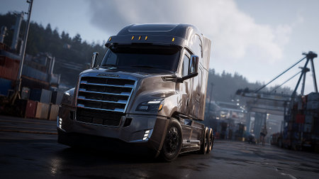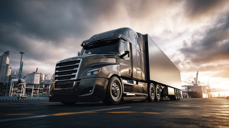 Digital Freight: Futuristic Truck Transport at Port with Data Visualization