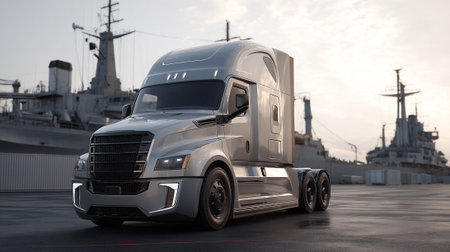 Modern Silver Truck and Ship at Port Ready for Delivery.